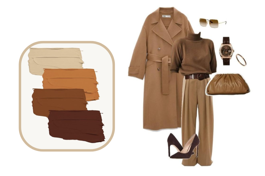 以棕色大地色為主調,透過深淺不一的順色系單品搭配,