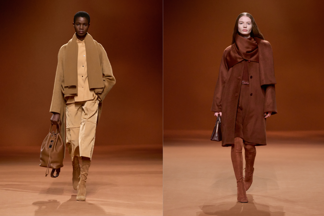 其中 Hermès 透過紅棕、米黃、金屬感的銅棕色系,