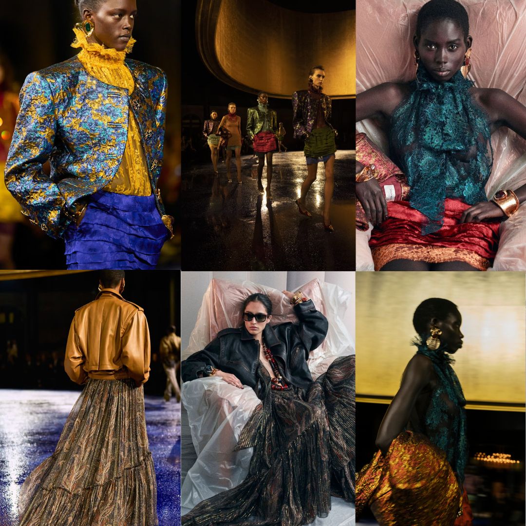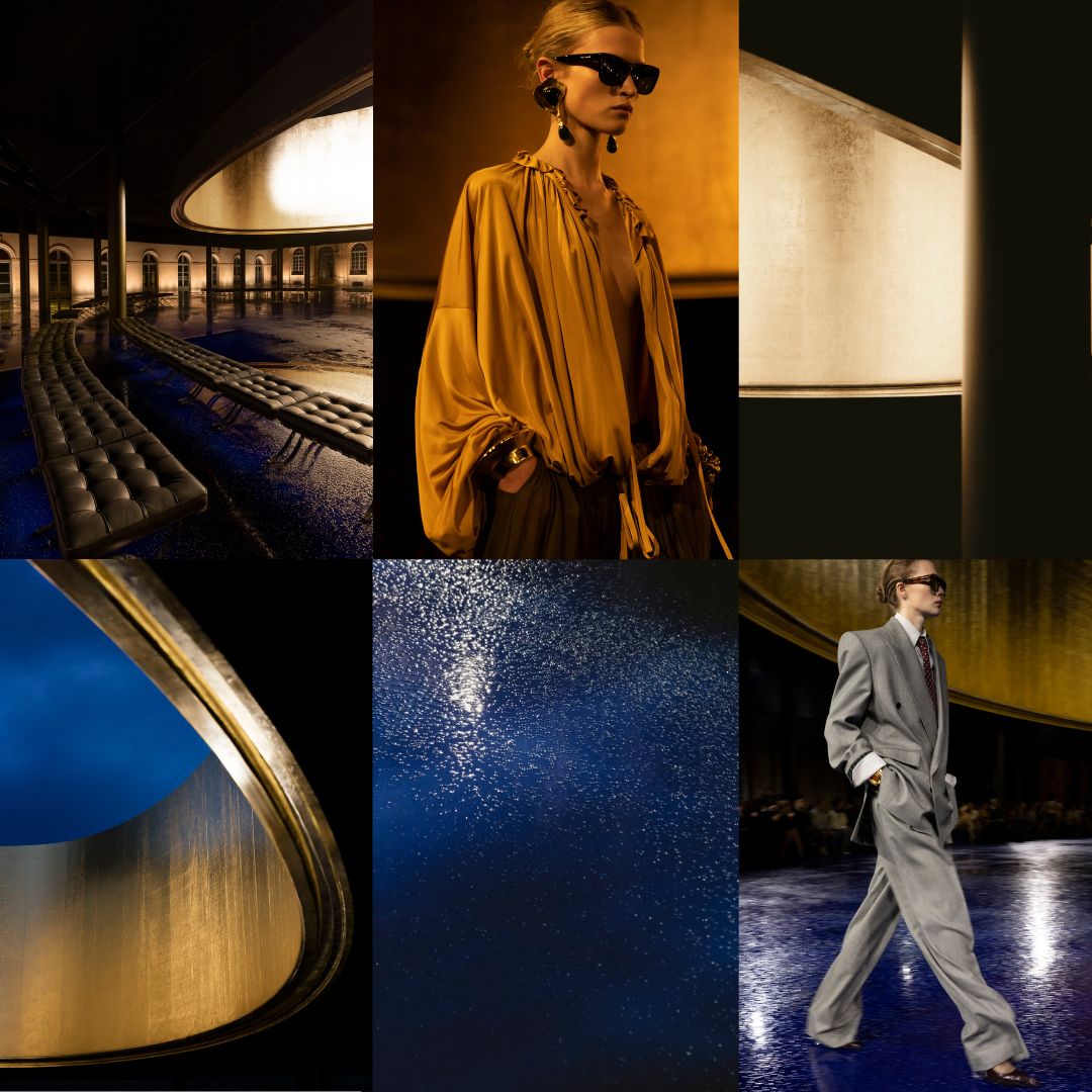 Saint Laurent 本季秀場以巨大金黃橢圓形飾帶圍繞成圈,彷彿是鑲金邊的相框,底色是用來象徵、致敬 Yves Saint Laurent 先生鍾愛之馬拉喀什花園的鈷藍色伸展台,色彩的碰撞帶來了反向的和諧,交織在一起,彷彿形塑出一張穿越時空的畫布,整幅場景像是打破了現實與夢境之間的界限,引領賓客走入全新維度。