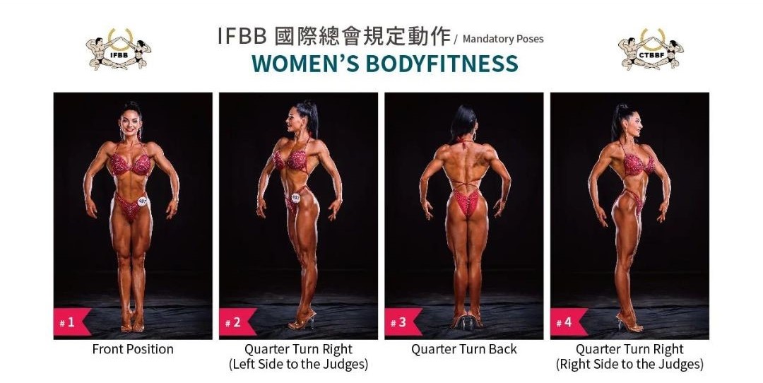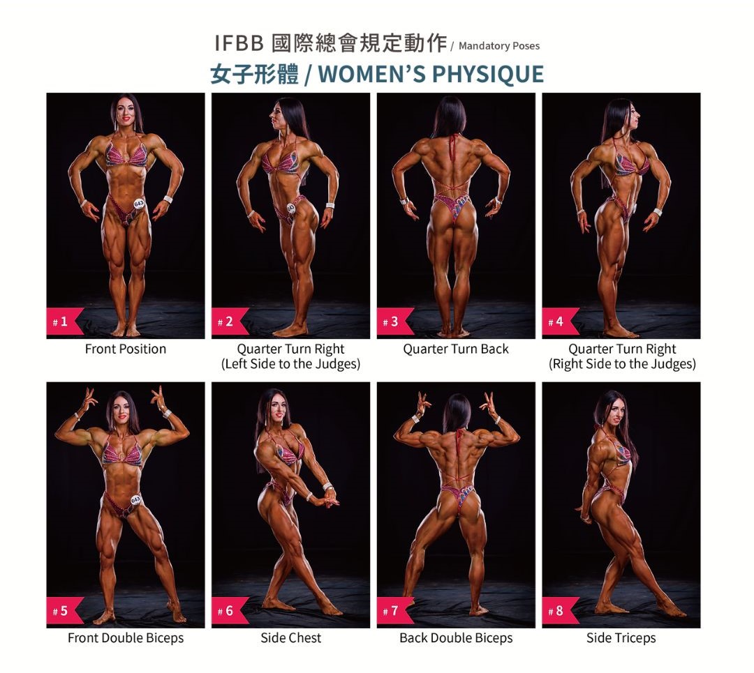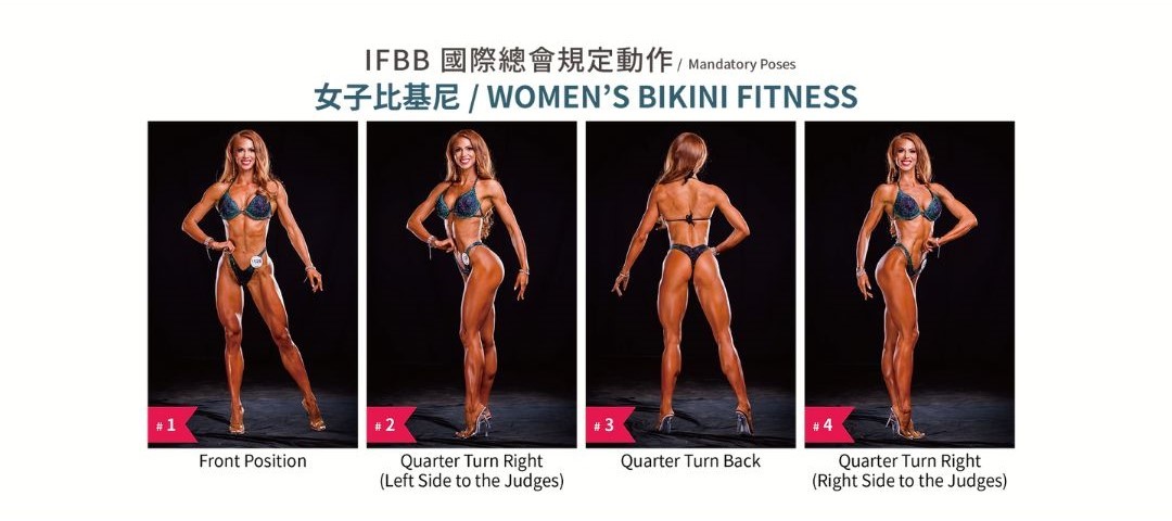 選手要穿著背後交叉式的連身比基尼,赤腳上台,擺出8個指定動作。
